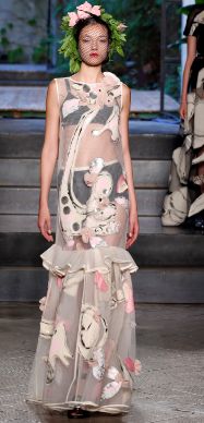 抽象的大尺寸提花和绣花织物,具有油画般的质感;超现实主义图案的精致丝质锦缎;鲜亮色彩的热带花卉和超现实主义的数码印花或冷转移印花织物;硬挺的亚麻以及棉混纺织物,具有了褶皱或纸质的立体廓形感;轻质泡状的氯丁橡胶材质及其它人造材质。