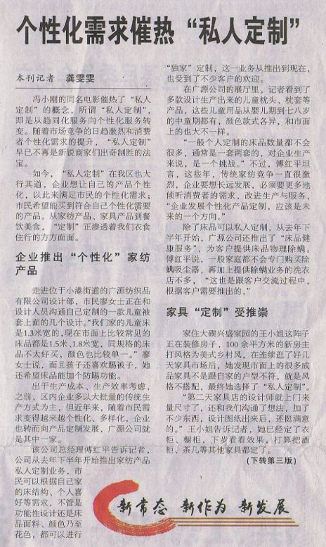 该公司总经理傅红平告诉记者,公司从去年下半年开始推出家纺产品私人定制业务,市民可以根据自己家的床结构、个人喜好等需求,不管是功能性设计还是床品面料、颜色乃至花色,都可以进行“独家”定制,这一业务从推出到现在,也受到了不少客户的欢迎。