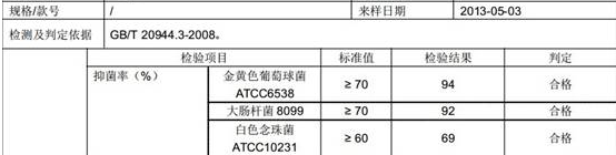 对大肠杆菌、金黄色葡萄球菌、白色念珠菌都有抵抗和抑制作用,洗涤50次保持抗菌功能.