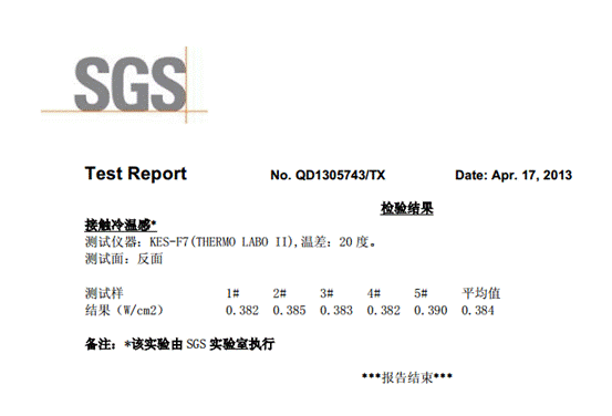 2、冰凉触感,经SGS检测Q-MAX达到0.384,高于同类产品。