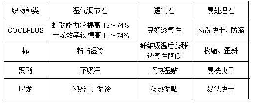 Coolplus纤维可纺性好,其强度、伸长率均高于纤维素纤维,与Tencel、Modal以及棉等纤维混纺,不但可以提高纱线的强度,而且可改善纱线的条干均匀度.由于其截面的几何特征,故其抗弯性能要优于其他圆形截面纤维,还增加了纤维间的抱合力,使织物蓬松、透气性好、光泽柔和、素雅效果好、手感舒适