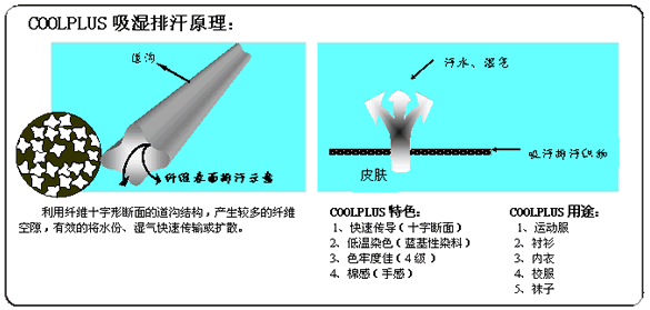 Coolplus纤维是一种仿生的新型高科技改性功能纤维,纤维截面为“+”型,表面形成细微沟槽,将细管原理成功地运用于纤维与织物结构之中,使之能快速吸湿、吸水、疏水、挥发和扩散,从而使穿着者保持皮肤的干爽。另外,纤维表面凹槽和微孔的存在利于染料的上染,纤维之间抱合力大,具有抗起球性.
