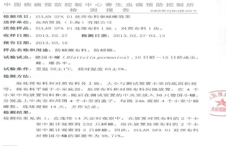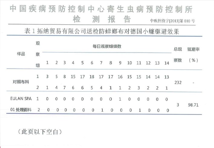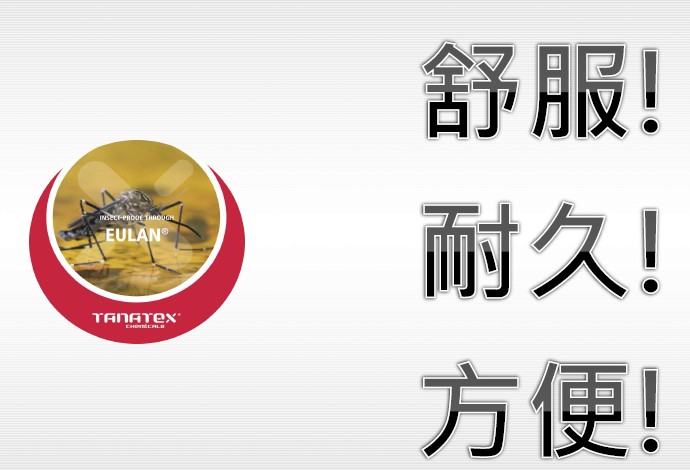 防蚊虫整理:赋予织物对蚂蚁、蟑螂等爬虫和蚊子、苍蝇等飞虫具有优异的趋避和倒伏功功效,同时保持织物原有属性,手感柔软,穿着舒适,经久耐洗,该整理满足NATO要求,严格遵循TL8305-0331,并通过Oko-tex100标准认可.