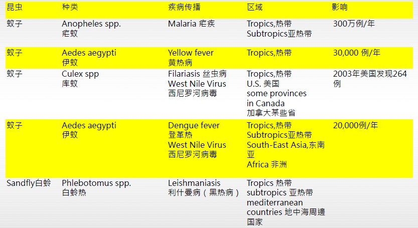 特别是在热带和亚热带区域蚊子会导致流行性疾病传播。下表列出了不同种类的文字可能导致的疾病。