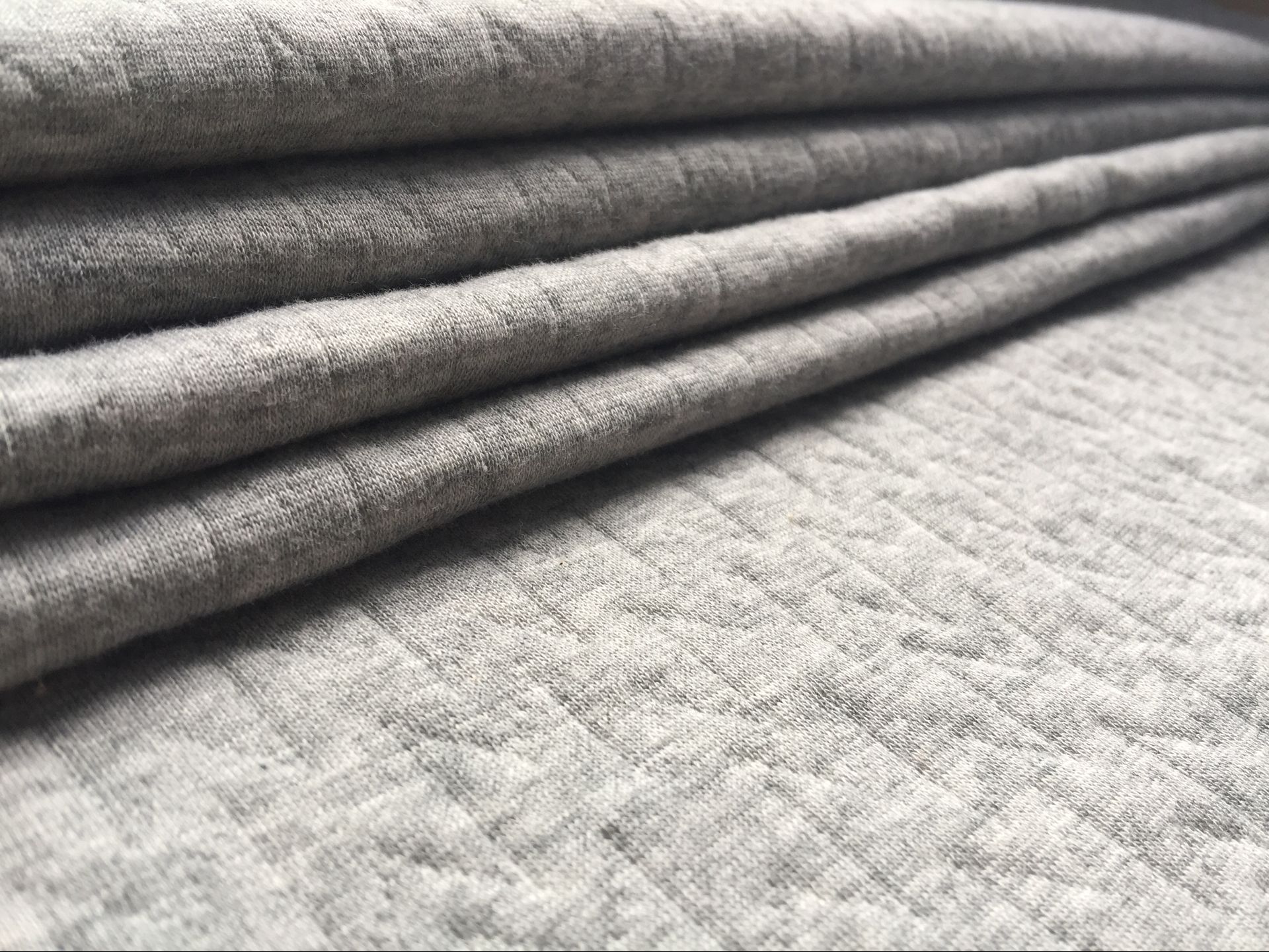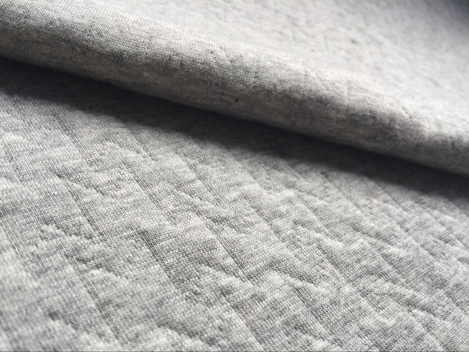 本款面料采用针织双面大提花结构,组织新颖、纹理清晰,且正反面异色,正面由灰色的高品质精梳麻灰纱织造而成,白色的贴肤面是选用优质的新疆棉,正反面链接处选用保暖长丝纤维,具有很好的保暖效果,同时,服装企业可根据自身需求进行双面裁剪应用。